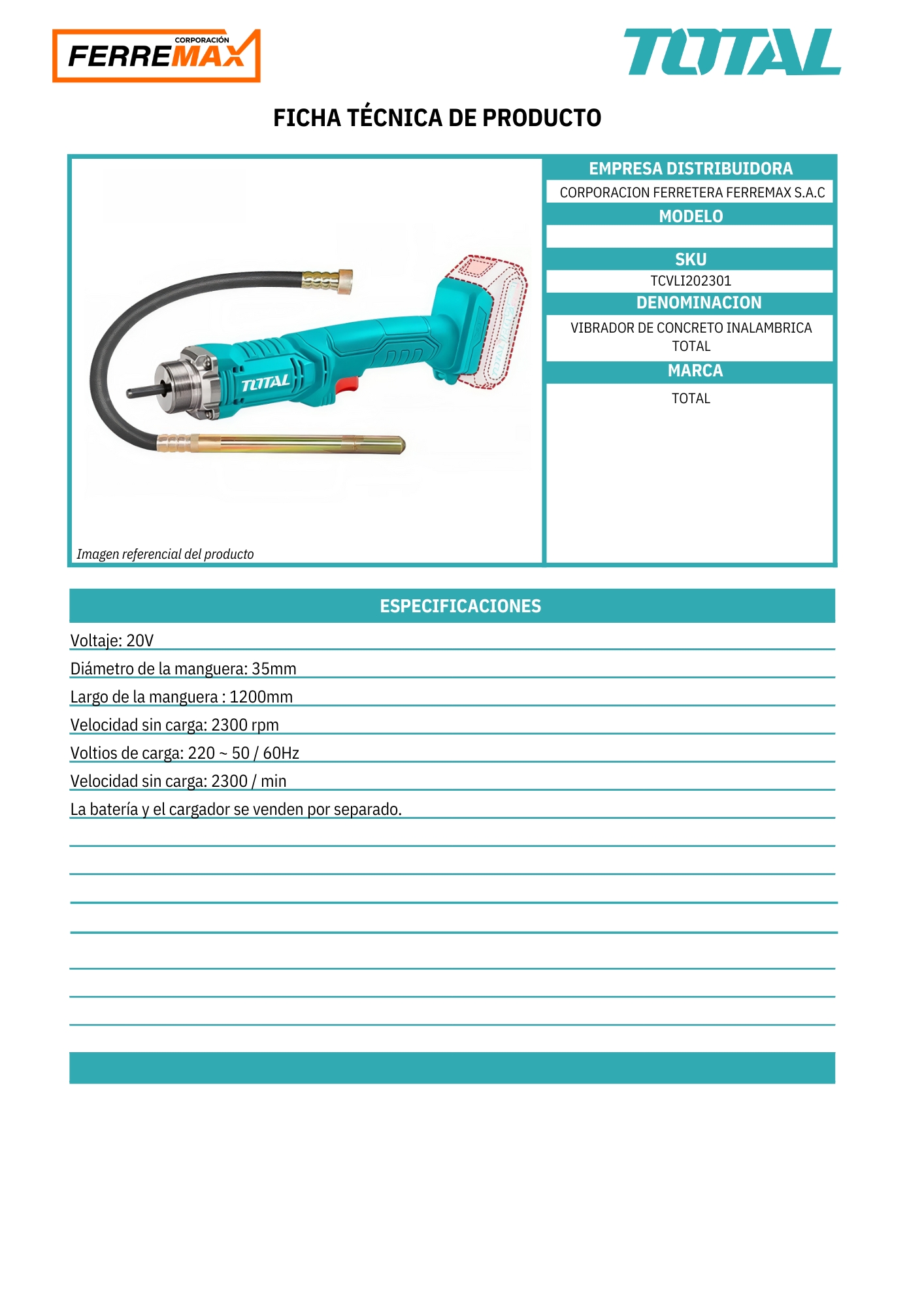 Descubre el Vibrador de Hormigón 2300rpm de TOTAL, tu aliado perfecto para trabajos profesionales en construcción. Con una sonda de 1200mm y potencia de 20v, este vibrador garantiza un mezclado homogéneo y eficiente del hormigón. Ideal para proyectos de cimentación, columnas y losas, su diseño inalámbrico te ofrece libertad de movimiento sin enredos de cables. Su velocidad de 2300rpm asegura un trabajo rápido y preciso, adaptándose a diferentes tipos de hormigón y agregados. ¡Con TOTAL, lleva tus trabajos de construcción al siguiente nivel!